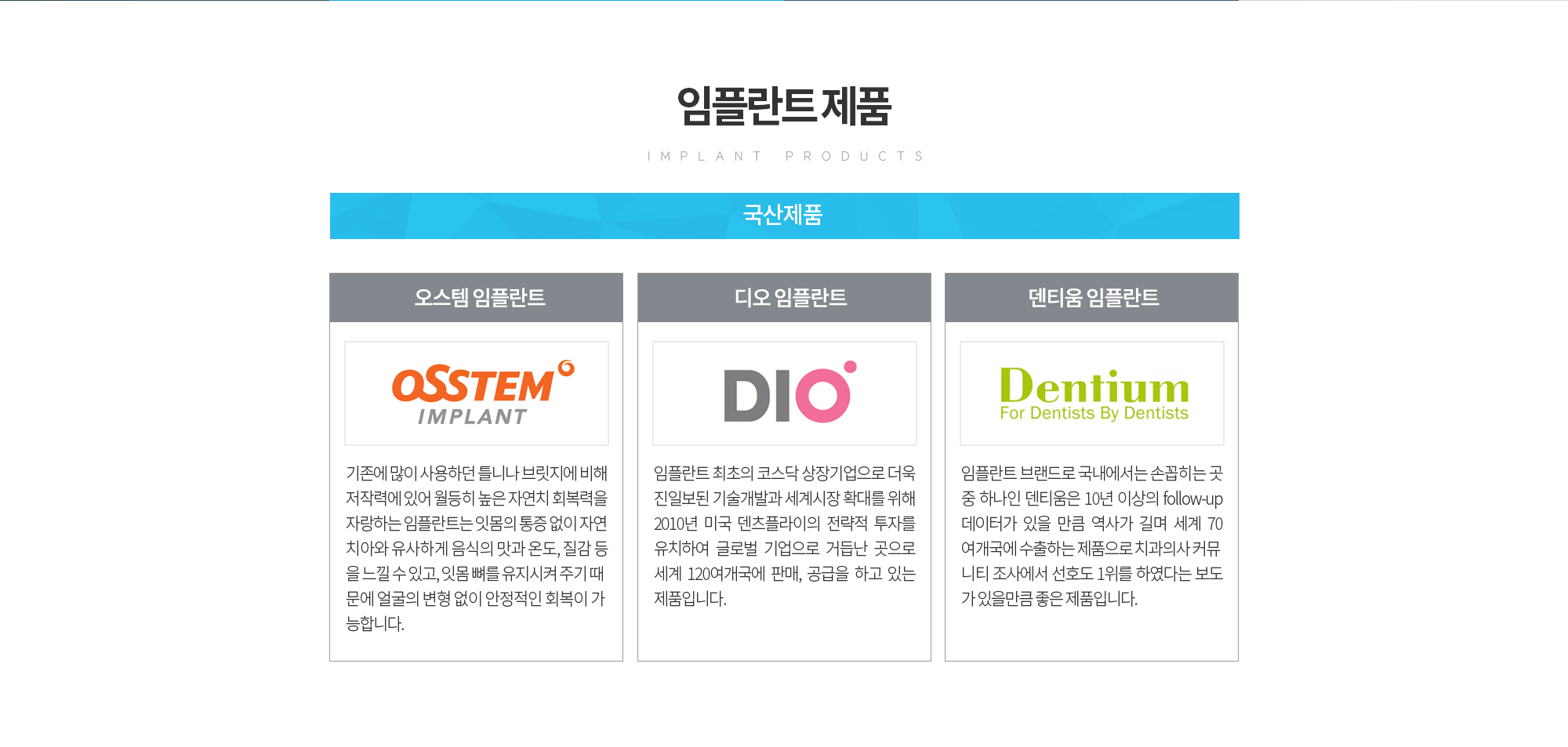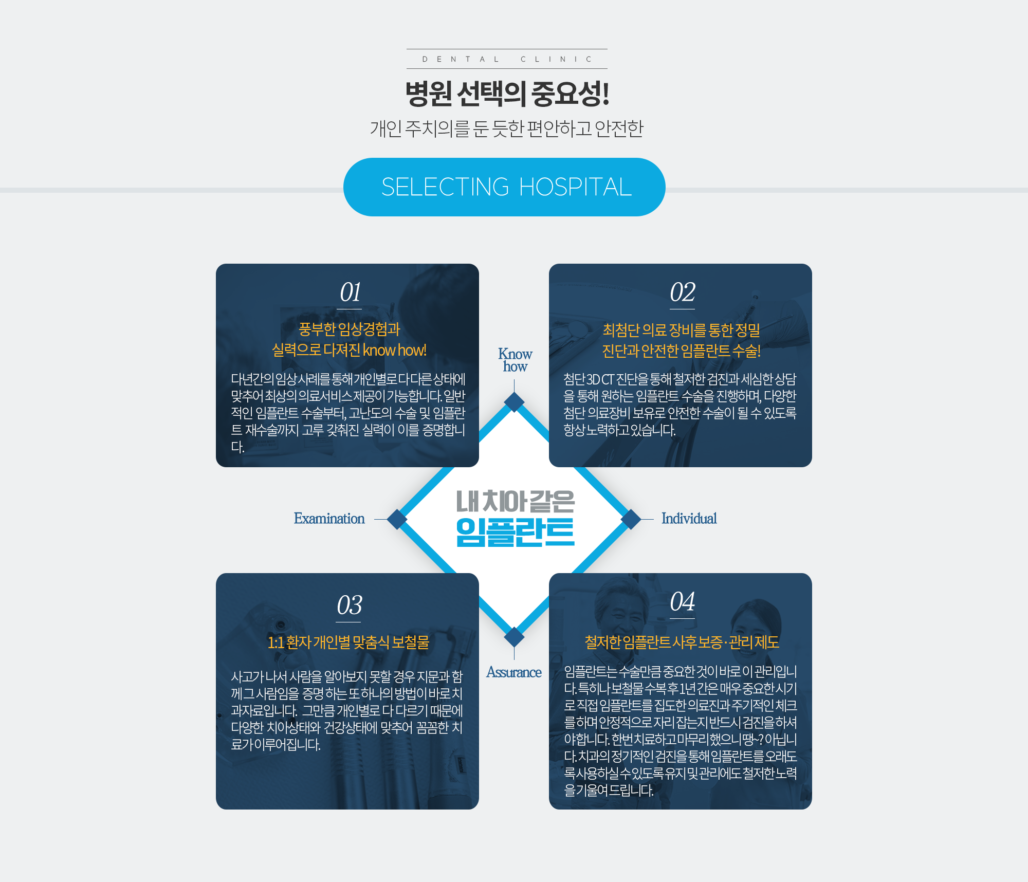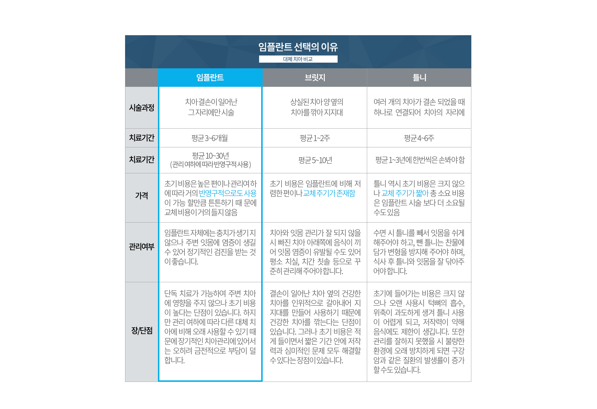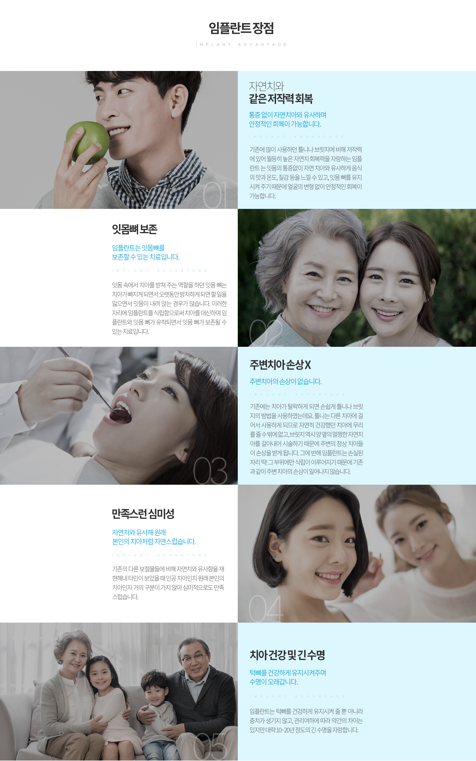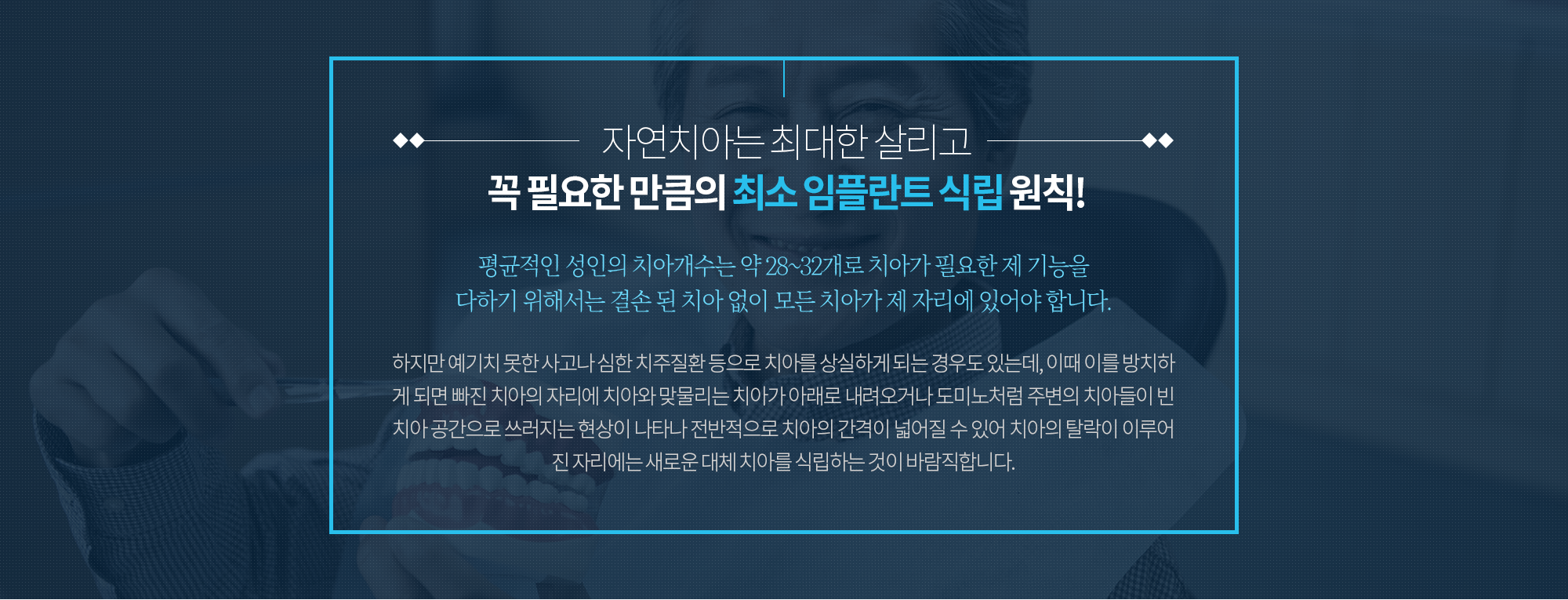 치주질환이나 사고 등으로 인해 상실된 자아의 자리에 인체에 무해하면서도 부작용이 거의 없는 티타늄으로 제작된 본체를 심고, 그 위에 내 자연 치와 유사한 보철물을 씌워 본래의 내 치아와 같은 기능을 회복시켜 주는 치료입니다.