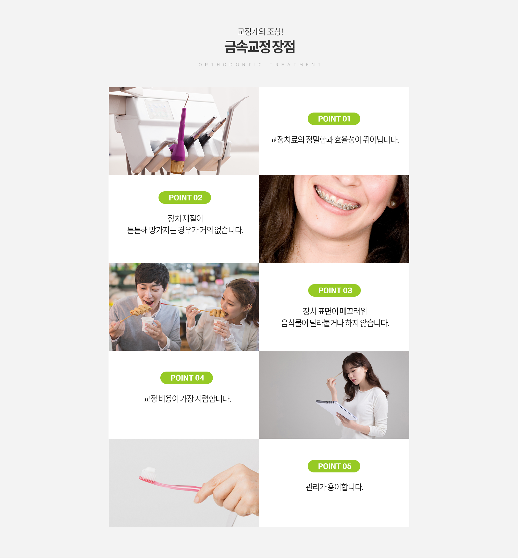 가장 보편적으로 많이 사용하는 금속(메탈)교정은 가장 오래된 교정 방법이기도 합니다. 이것은 현재도 가장 많이 사용되고 있는 장치로 눈에 띄는 금속 재료를 사용하다 보니 심미적으로 거부감을 줄 수도 있어 점점 선택률이 줄어들고 있습니다만 치아 이동에 효율적이며 비용 또한 저렴하기 때문에 특히 소아 환자들에게 많이 사용되는 방법입니다.