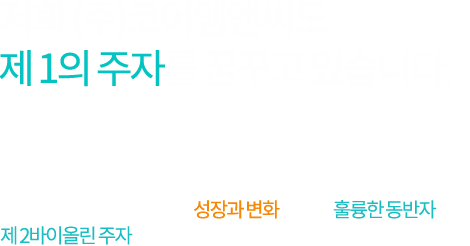인사말 저희 (주)코어엠앤씨 홈페이지를 방문해 주셔서 감사합니다. (주)코어엠앤씨는 Client의 성장과 변화를 위해 훌륭한 동반자이자 제2 바이올린 주자가 되어드릴 수 있습니다.