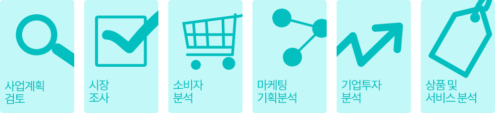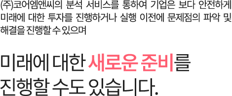 분석 서비스 신규사업계획, 투자, 개발상품, 마케팅 등의 부분에 대한 타당성 분석! (주)코어엠앤씨 분석 서비스를 통하여 기업은 신규사업계획, 투자, 개발상품, 마케팅 등의 부분에 대하여 타당성 분석을 제공 받을 수 있으며 이를 바탕으로 계획의 수정 및 실행에 대한 판단 자료로 활용하실 수 있습니다.